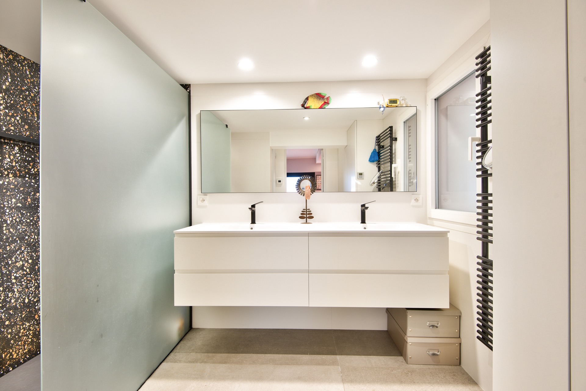 À l’étage, vous trouverez une belle suite parentale avec salle d’eau, WC et dressing, un bureau, ainsi qu’une grande chambre double modulable en deux chambres séparées. Une seconde salle d’eau avec WC complète l’espace nuit.